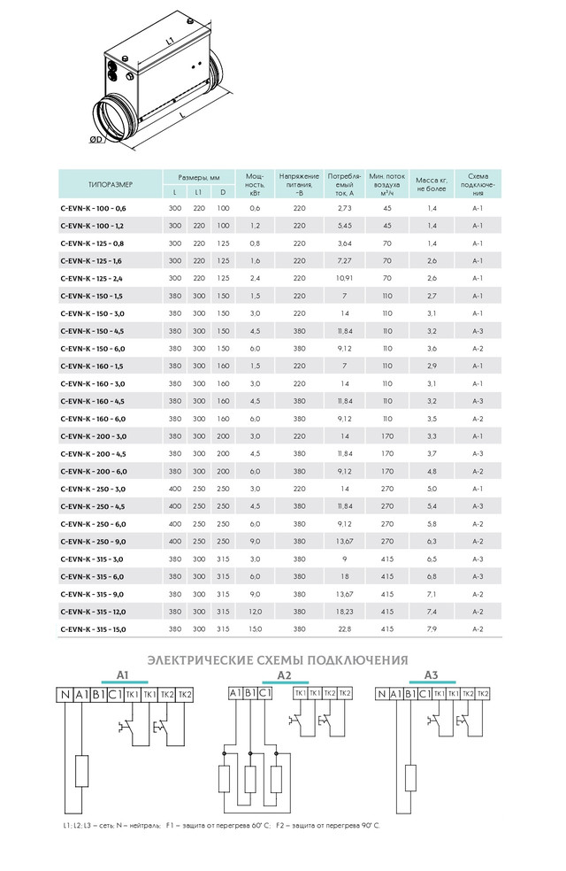 Нижче представлені електричні схеми підключення та інші типорозміри електричних круглих повітронагрівачів C-EVN-K і їх характеристики.