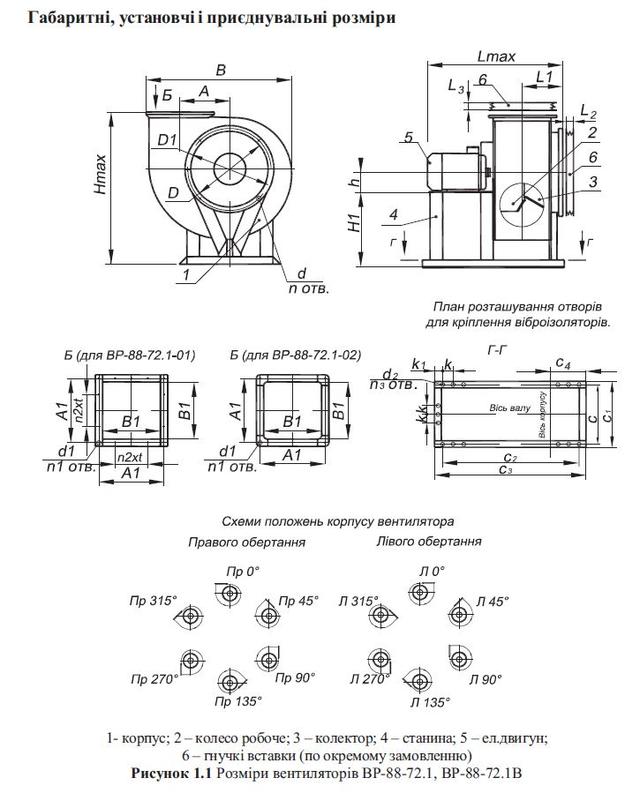 Опис і позначення вентиляторів містить спіральний корпус, робоче колесо, колектор, станину та двигун. Вентилятори можуть бути додатково комплектовані віброізоляторами, гнучкими вставками та огорожами електродвигунів для захисту від атмосферних опадів.